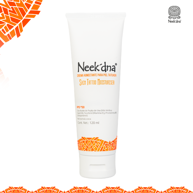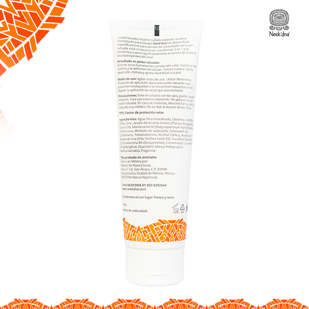 La piel tatuada requiere cuidado especial, por ello Neek’dna Crema Humectante para piel tatuada fue desarrollada específicamente para atender las necesidades de la piel tatuada al estar compuesta por una fórmula 3 en 1, la cual humecta y suaviza significativamente la barrera de la piel e incorpora protección solar.