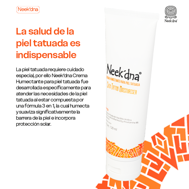 La piel tatuada requiere cuidado especial, por ello Neek’dna Crema Humectante para piel tatuada fue desarrollada específicamente para atender las necesidades de la piel tatuada al estar compuesta por una fórmula 3 en 1, la cual humecta y suaviza significativamente la barrera de la piel e incorpora protección solar.